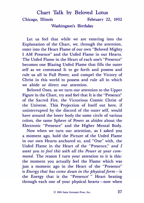 Mrs GW Ballard - February 22, 1952: Let us feel that while we are entering into the Explanation of the Chart, we, through the attention, enter into the Heart Flame of our own "Beloved Mighty I AM Presence" and the Unfed Flame in our Hearts. The Unfed Flame in the Heart of each one's "Presence" becomes one Blazing Unfed Flame that fills the outer self as we command It to go forth...