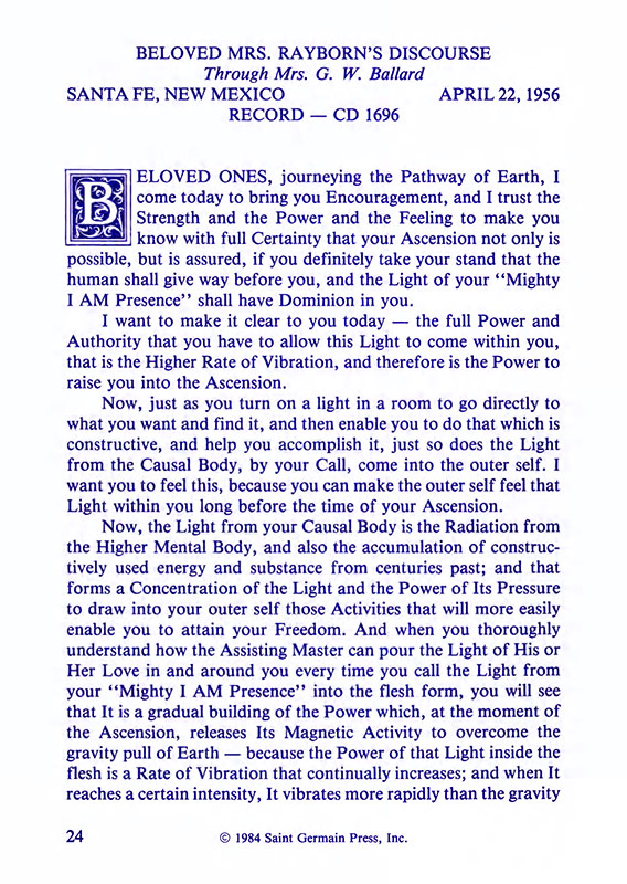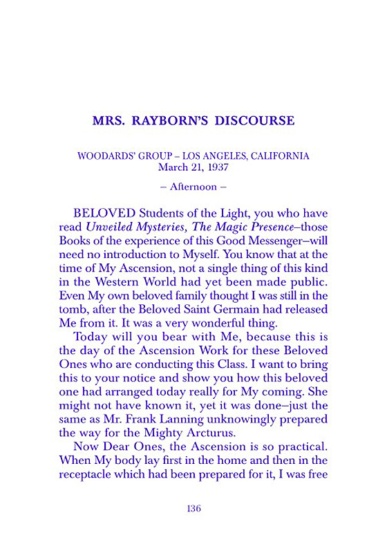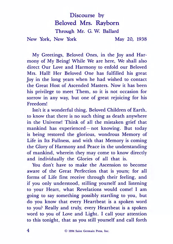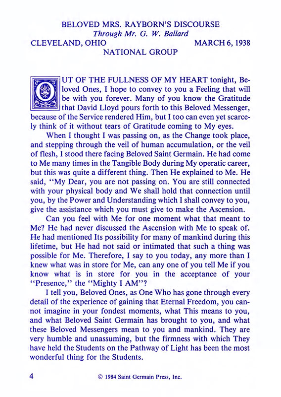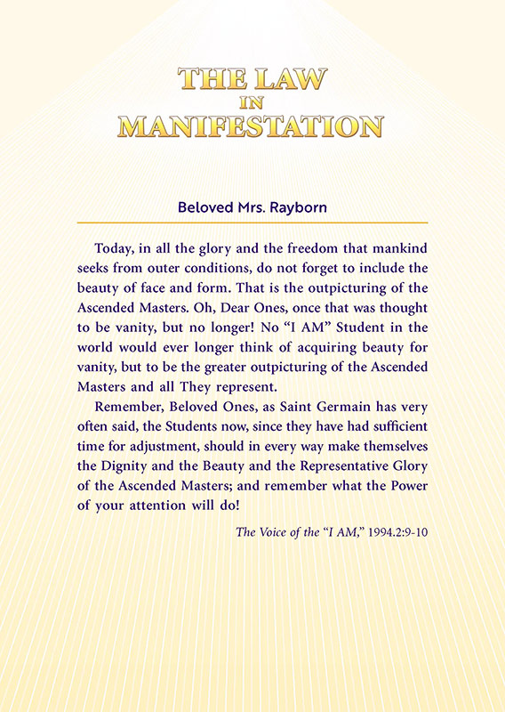 The "Voice of the I AM" monthly Magazine is the Outpouring of the Love, Light, and Illumination from the Beloved Ascended Masters for the enlightenment of all mankind-the Ascended Masters' Instruction on the Fiery Christ Truth of the "Beloved Mighty I AM Presence." The Ascended Masters' Instruction on the Great Laws of Life was first brought forth by the Ascended Master Saint Germain, through His Accredited Messengers, Mr and Mrs GW Ballard. In the early 1930s the Ballards established Saint Germain Foundation and Saint Germain Press, currently a worldwide organization with hundreds of "I AM" Temples and Sanctuaries throughout the world. The "I AM" Activity of Saint Germain Foundation presents this Original Ascended Master Instruction in its pure, unadulterated form, free from human interpretation, in The Voice of the "I AM" monthly Magazine, in the Books of the Saint Germain Series, and in other material released by Saint Germain Foundation and distributed through Saint Germain Press.