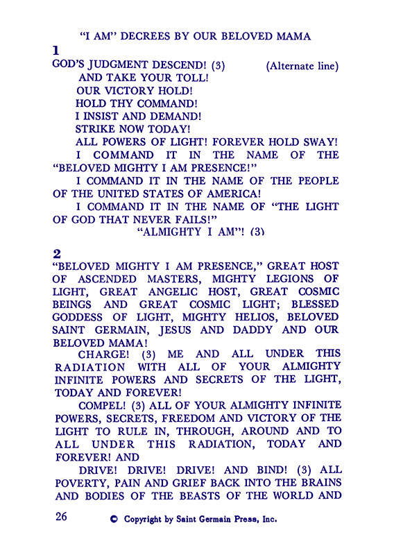 GOD'S JUDGMENT DESCEND! (3) (Alternate line) AND TAKE YOUR TOLL! OUR VICTORY HOLD! HOLD THY COMMAND! I INSIST AND DEMAND! STRIKE NOW TODAY! ALL POWERS OF LIGHT! FOREVER HOLD SWAY! I COMMAND IT IN THE NAME OF THE "BELOVED MIGHTY I AM PRESENCE! ...