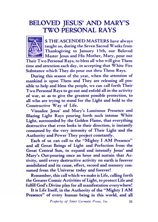 BELOVED JESUS' AND MARY'S TWO PERSONAL RAYSAS THE ASCENDED MASTERS have always taught us, during the Seven Sacred Weeks from Thanksgiving to January 15th, our Beloved Master Jesus and His Mother, Mary, pour out Their Two Personal Rays, to bless all who will give Them time and attention each day; ...About the Edition