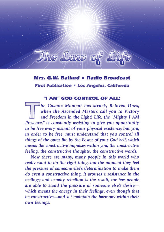 Radio Broadcast, Mrs GW Ballard: The Cosmic Moment has struck, Beloved Ones in America, when the Ascended Masters call you to Victory and Freedom in the Light! Life, the "Mighty I AM Presence," is constantly assisting to give you opportunityto be free every instant of your physical existence...