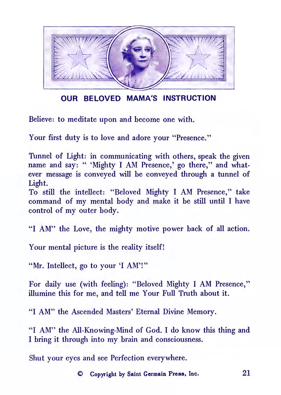 Believe: to meditate upon and become one with.Your first duty is to love and adore your "Presence."Tunnel of Light: in communicating with others, speak the given name and say: " Mighty I AM Presence,'