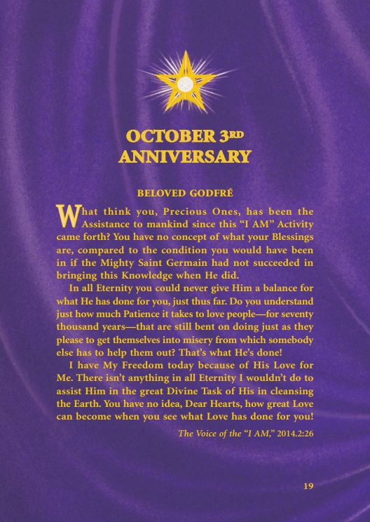 The "Voice of the I AM" monthly Magazine is the Outpouring of the Love, Light, and Illumination from the Beloved Ascended Masters for the enlightenment of all mankind-the Ascended Masters' Instruction on the Fiery Christ Truth of the "Beloved Mighty I AM Presence." The Ascended Masters' Instruction on the Great Laws of Life was first brought forth by the Ascended Master Saint Germain, through His Accredited Messengers, Mr and Mrs GW Ballard. In the early 1930s the Ballards established Saint Germain Foundation and Saint Germain Press, currently a worldwide organization with hundreds of "I AM" Temples and Sanctuaries throughout the world. The "I AM" Activity of Saint Germain Foundation presents this Original Ascended Master Instruction in its pure, unadulterated form, free from human interpretation, in The Voice of the "I AM" monthly Magazine, in the Books of the Saint Germain Series, and in other material released by Saint Germain Foundation and distributed through Saint Germain Press.