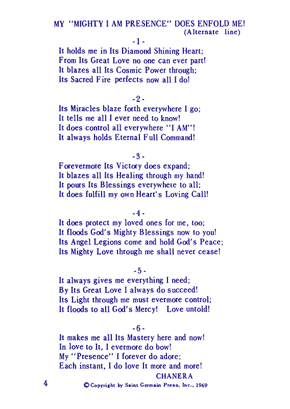 MY "MIGHTY I AM PRESENCE" DOES ENFOLD ME! (Alternate line) It holds me in Its Diamond Shining Heart; From Its Great Love no one can ever part! It blazes all Its Cosmic Power through...