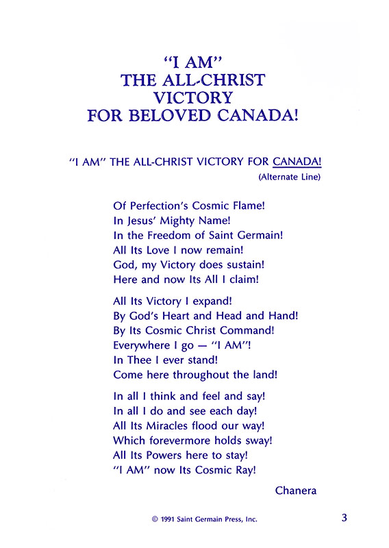 "I AM" THE ALL-CHRIST VICTORY FOR CANADA! (Alternate Line) Of Perfection's Cosmic Flame! In Jesus' Mighty Name! In the Freedom of Saint Germain! All Its Love I now remain! ...