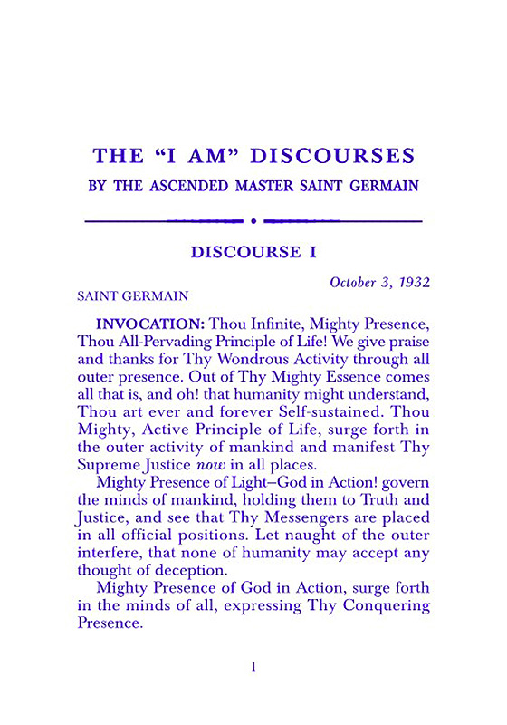 INVOCATION: Thou Infinite, Mighty Presence, Thou All-Pervading Principle of Life! We give praise and thanks for Thy Wondrous Activity through all outer presence. Out of Thy Mighty Essence comes all that is, and oh! that humanity might understand, Thou art ever and forever Self-sustained. Thou Mighty, Active Principle of Life, surge forth in the outer activity of mankind and manifest Thy Supreme Justice now in all places. ...