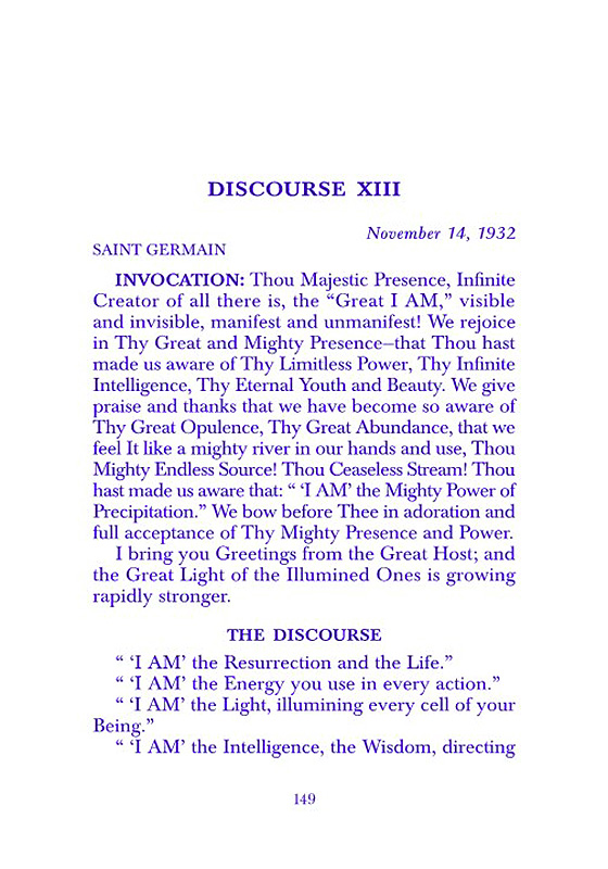 INVOCATION: Thou Majestic Presence, Infinite Creator of all there is, the Great I AM, visible and invisible, manifest and unmanifest! We rejoice in Thy Great and Mighty Presence-that Thou hast made us aware of Thy Limitless Power, Thy Infinite Intelligence, Thy Eternal Youth and Beauty. We give praise and thanks that we have become so aware of Thy Great Opulence, Thy Great Abundance, that we feel It like a mighty river in our hands and use, Thou Mighty Endless Source! ...