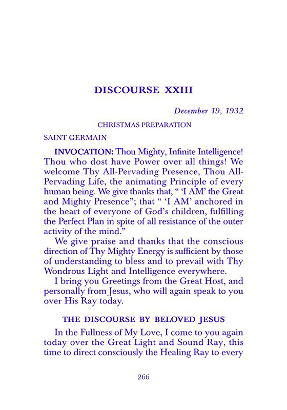 INVOCATION: Thou Mighty, Infinite Intelligence! Thou who dost have Power over all things! We welcome Thy All-Pervading Presence, Thou All-Pervading Life, the animating Principle of every human being. We give thanks that, I AM the Great and Mighty Presence; that I AM anchored in the heart of everyone of God's children, fulfilling the Perfect Plan in spite of all resistance of the outer activity of the mind. ...