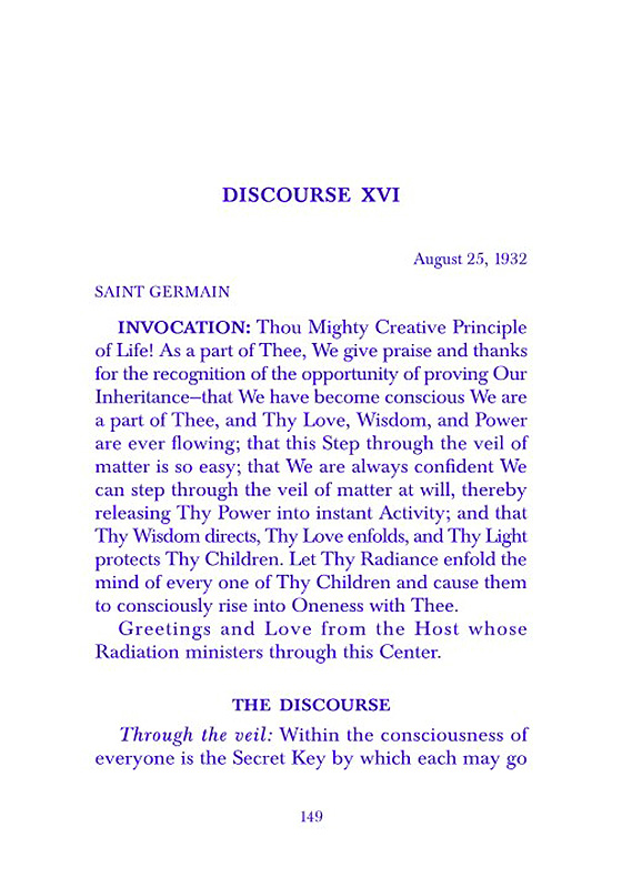 INVOCATION: Thou Mighty Creative Principle of Life! As part of Thee, We give praise and thanks for the recognition of the opportunity of proving Our Inheritance-that we have become conscious that We are a part of Thee, and Thy Love, Wisdom, and Power are ever flowing; that this Step through the veil of matter is so easy....