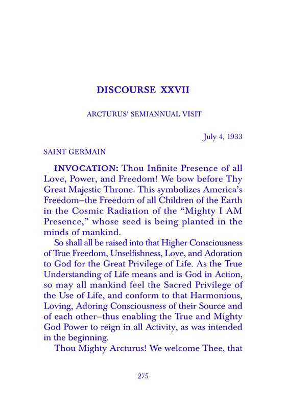 INVOCATION: Thou Infinite Presence of all Love, Power, and Freedom! We bow before Thy Great Majestic Throne. This symbolizes America's Freedom-the Freedom of all Children of the Earth in the Cosmic Radiation of the "Mighty I AM Presence," whose seed is being planted in the minds of mankind. ...