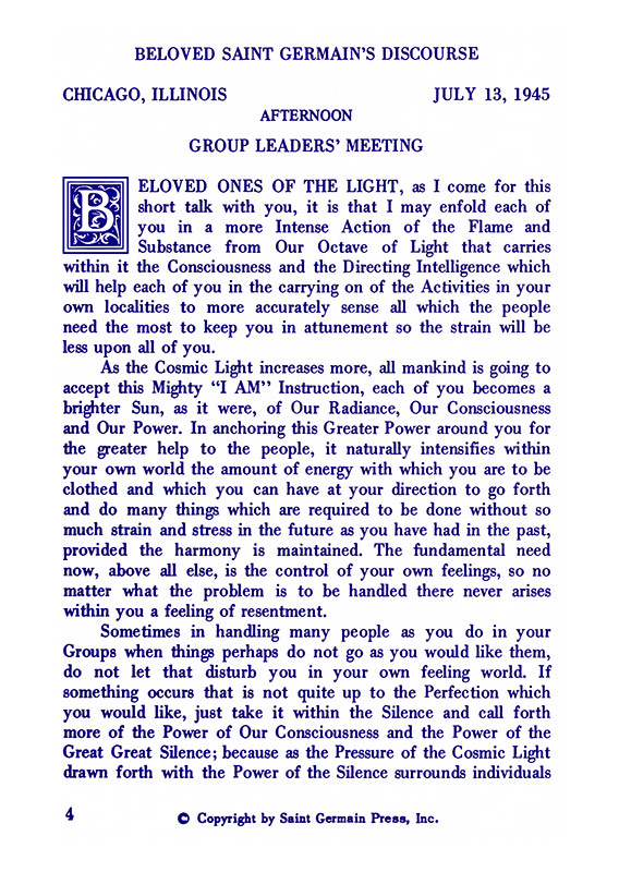 The "Voice of the I AM" monthly Magazine is the Outpouring of the Love, Light, and Illumination from the Beloved Ascended Masters for the enlightenment of all mankind-the Ascended Masters' Instruction on the Fiery Christ Truth of the "Beloved Mighty I AM Presence." The Ascended Masters' Instruction on the Great Laws of Life was first brought forth by the Ascended Master Saint Germain, through His Accredited Messengers, Mr and Mrs GW Ballard. In the early 1930s the Ballards established Saint Germain Foundation and Saint Germain Press, currently a worldwide organization with hundreds of "I AM" Temples and Sanctuaries throughout the world. The "I AM" Activity of Saint Germain Foundation presents this Original Ascended Master Instruction in its pure, unadulterated form, free from human interpretation, in The Voice of the "I AM" monthly Magazine, in the Books of the Saint Germain Series, and in other material released by Saint Germain Foundation and distributed through Saint Germain Press.