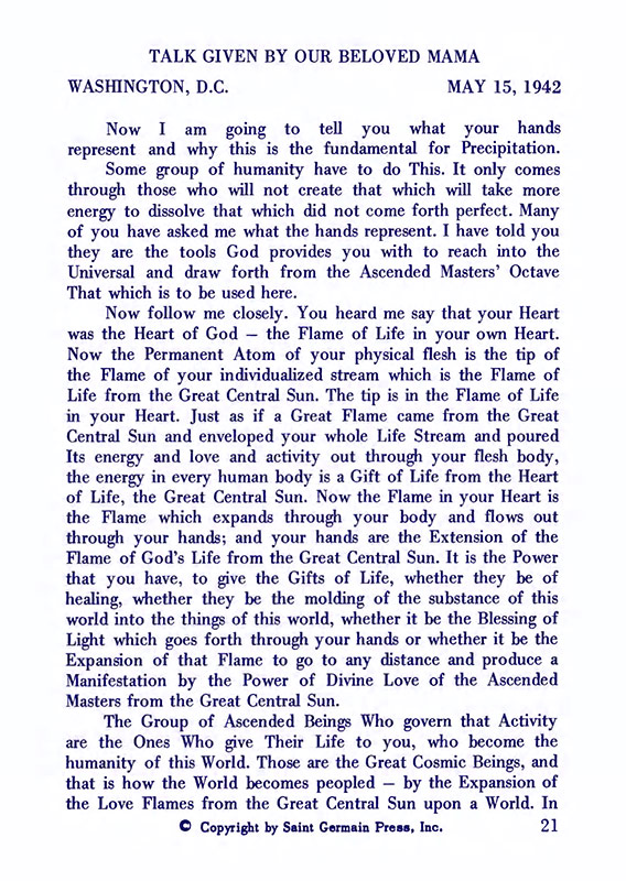 Now I am going to tell you what your hands represent and why this is the fundamental for Precipitation. Some group of humanity have to do This. It only comes through those who will not create that which will take more energy to dissolve that which did not come forth perfect. Many of you have asked me what the hands represent. ...About the Edition