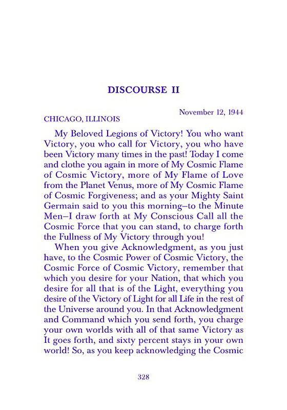 My Beloved Legions of Victory! You who want Victory, you who call for Victory, you who have been Victory many times in the past! Today I come and clothe you again in more of My Cosmic Flame of Cosmic Victory, more of My Flame of Love from the Planet Venus, more of My Cosmic Flame of Cosmic Forgiveness; and as your Mighty Saint Germain said to you this morning-to the Minute Men-I draw forth at My Conscious Call all the Cosmic Force that you can stand, to charge forth the Fullness of My Victory through you! ...About the Edition