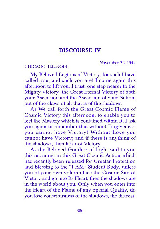 My Beloved Legions of Victory, for such I have called you, and such you are! I come again this afternoon to lift you, I trust, one step nearer to the Mighty Victory-the Great Eternal Victory of both your Ascension and the Ascension of your Nation, out of the claws of all that is of the shadows.As We call forth the Great Cosmic Flame of Cosmic Victory this afternoon, to enable you to feel the Mastery which is contained within It, I ask you again to remember that without Forgiveness, you cannot have Victory! ...