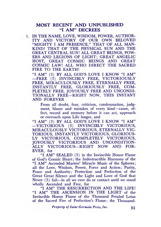 The "Voice of the I AM" monthly Magazine is the Outpouring of the Love, Light, and Illumination from the Beloved Ascended Masters for the enlightenment of all mankind-the Ascended Masters' Instruction on the Fiery Christ Truth of the "Beloved Mighty I AM Presence." The Ascended Masters' Instruction on the Great Laws of Life was first brought forth by the Ascended Master Saint Germain, through His Accredited Messengers, Mr and Mrs GW Ballard. In the early 1930s the Ballards established Saint Germain Foundation and Saint Germain Press, currently a worldwide organization with hundreds of "I AM" Temples and Sanctuaries throughout the world. The "I AM" Activity of Saint Germain Foundation presents this Original Ascended Master Instruction in its pure, unadulterated form, free from human interpretation, in The Voice of the "I AM" monthly Magazine, in the Books of the Saint Germain Series, and in other material released by Saint Germain Foundation and distributed through Saint Germain Press.You might also like