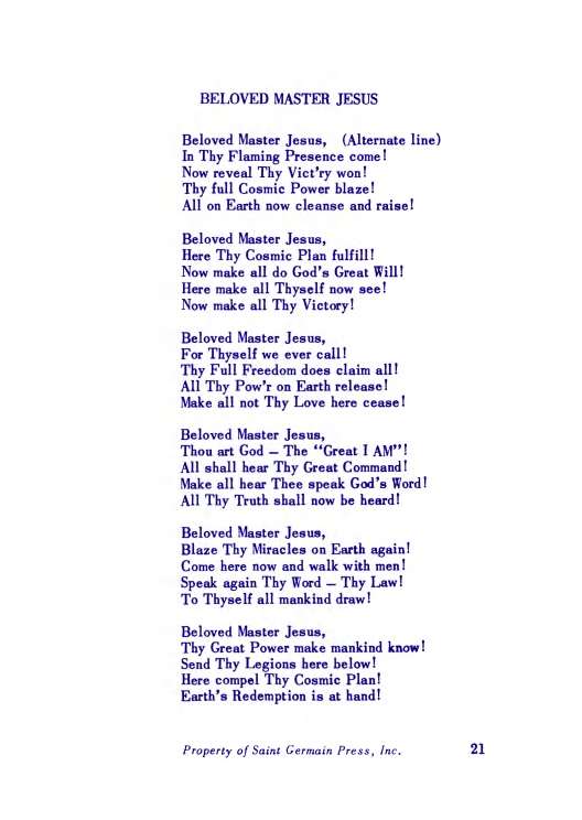 BELOVED MASTER JESUSBeloved Master Jesus, (Alternate line) In Thy Flaming Presence… More