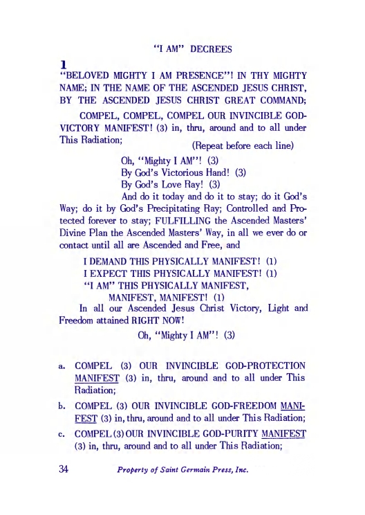 The "Voice of the I AM" monthly Magazine is the Outpouring of the Love, Light, and Illumination from the Beloved Ascended Masters for the enlightenment of all mankind-the Ascended Masters' Instruction on the Fiery Christ Truth of the "Beloved Mighty I AM Presence." The Ascended Masters' Instruction on the Great Laws of Life was first brought forth by the Ascended Master Saint Germain, through His Accredited Messengers, Mr and Mrs GW Ballard. In the early 1930s the Ballards established Saint Germain Foundation and Saint Germain Press, currently a worldwide organization with hundreds of "I AM" Temples and Sanctuaries throughout the world. The "I AM" Activity of Saint Germain Foundation presents this Original Ascended Master Instruction in its pure, unadulterated form, free from human interpretation, in The Voice of the "I AM" monthly Magazine, in the Books of the Saint Germain Series, and in other material released by Saint Germain Foundation and distributed through Saint Germain Press.