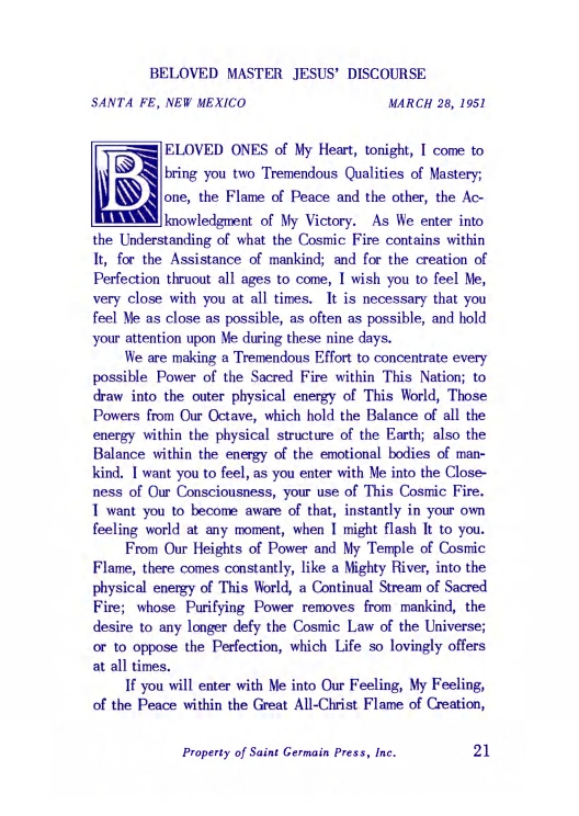 The "Voice of the I AM" monthly Magazine is the Outpouring of the Love, Light, and Illumination from the Beloved Ascended Masters for the enlightenment of all mankind-the Ascended Masters' Instruction on the Fiery Christ Truth of the "Beloved Mighty I AM Presence." The Ascended Masters' Instruction on the Great Laws of Life was first brought forth by the Ascended Master Saint Germain, through His Accredited Messengers, Mr and Mrs GW Ballard. In the early 1930s the Ballards established Saint Germain Foundation and Saint Germain Press, currently a worldwide organization with hundreds of "I AM" Temples and Sanctuaries throughout the world. The "I AM" Activity of Saint Germain Foundation presents this Original Ascended Master Instruction in its pure, unadulterated form, free from human interpretation, in The Voice of the "I AM" monthly Magazine, in the Books of the Saint Germain Series, and in other material released by Saint Germain Foundation and distributed through Saint Germain Press.Associated Items
