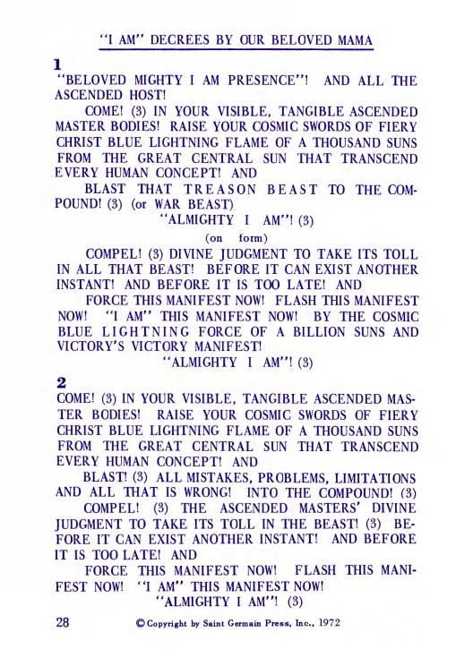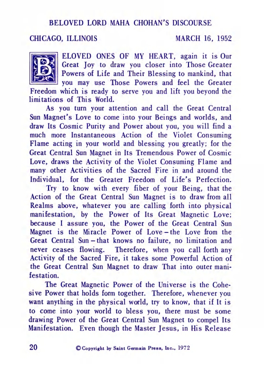 The "Voice of the I AM" monthly Magazine is the Outpouring of the Love, Light, and Illumination from the Beloved Ascended Masters for the enlightenment of all mankind-the Ascended Masters' Instruction on the Fiery Christ Truth of the "Beloved Mighty I AM Presence." The Ascended Masters' Instruction on the Great Laws of Life was first brought forth by the Ascended Master Saint Germain, through His Accredited Messengers, Mr and Mrs GW Ballard. In the early 1930s the Ballards established Saint Germain Foundation and Saint Germain Press, currently a worldwide organization with hundreds of "I AM" Temples and Sanctuaries throughout the world. The "I AM" Activity of Saint Germain Foundation presents this Original Ascended Master Instruction in its pure, unadulterated form, free from human interpretation, in The Voice of the "I AM" monthly Magazine, in the Books of the Saint Germain Series, and in other material released by Saint Germain Foundation and distributed through Saint Germain Press.