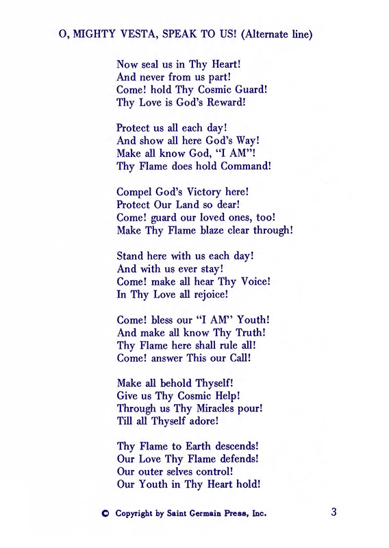 O, MIGHTY VESTA, SPEAK TO US! (Alternate line) Now seal us in Thy Heart! And never… More