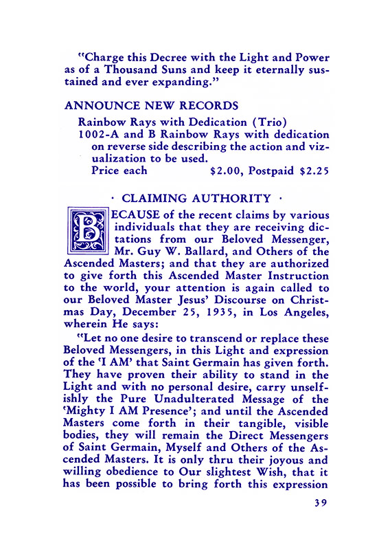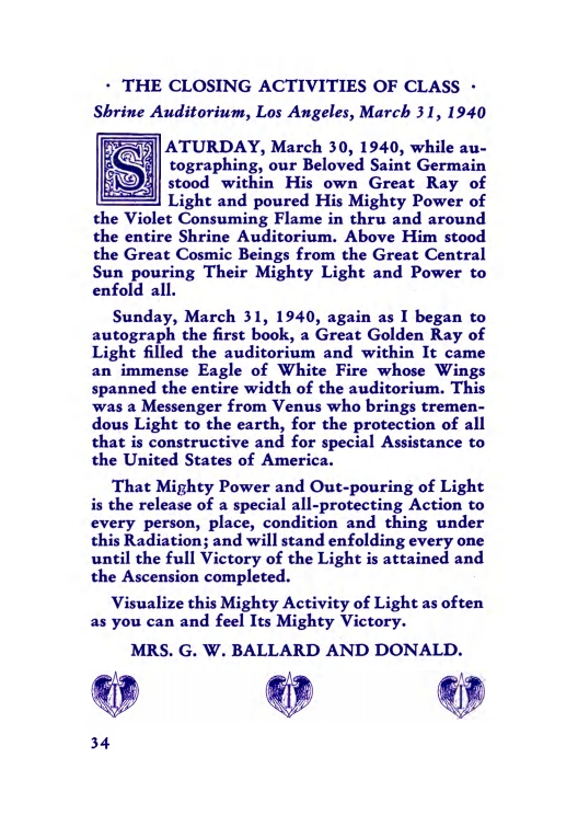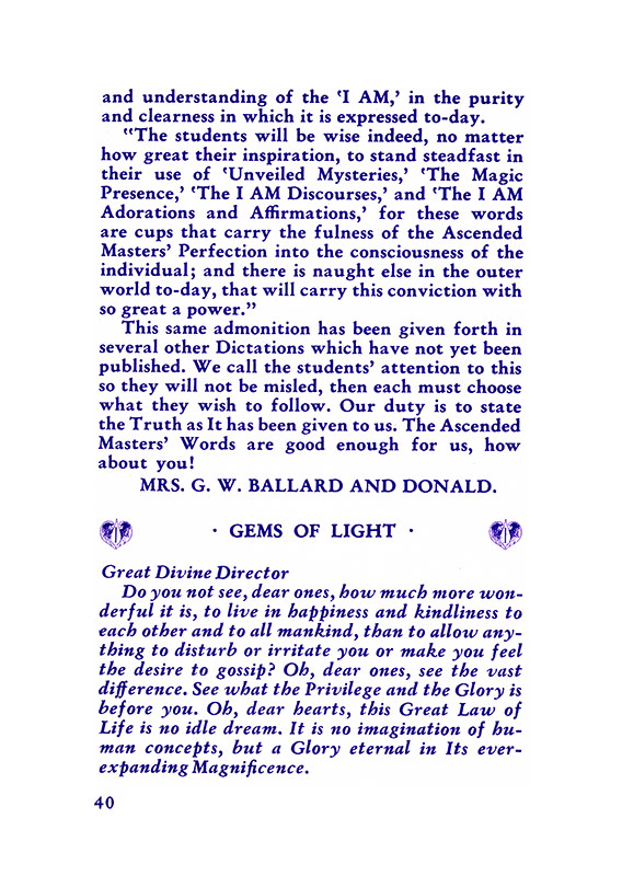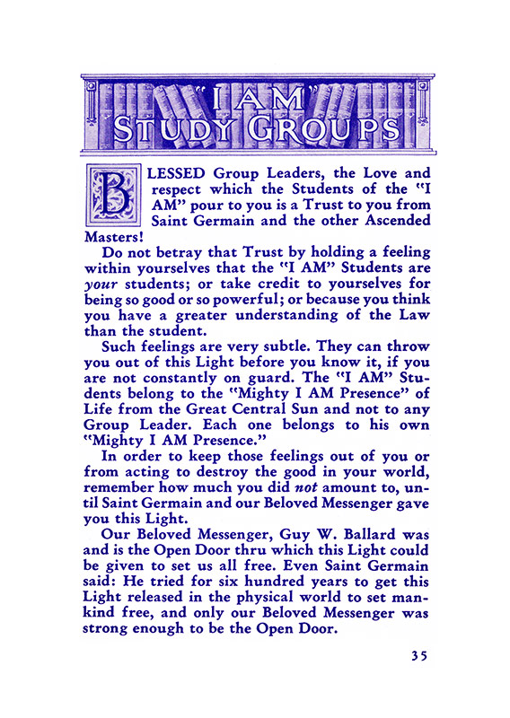 The "Voice of the I AM" monthly Magazine is the Outpouring of the Love, Light, and Illumination from the Beloved Ascended Masters for the enlightenment of all mankind-the Ascended Masters' Instruction on the Fiery Christ Truth of the "Beloved Mighty I AM Presence." The Ascended Masters' Instruction on the Great Laws of Life was first brought forth by the Ascended Master Saint Germain, through His Accredited Messengers, Mr and Mrs GW Ballard. In the early 1930s the Ballards established Saint Germain Foundation and Saint Germain Press, currently a worldwide organization with hundreds of "I AM" Temples and Sanctuaries throughout the world. The "I AM" Activity of Saint Germain Foundation presents this Original Ascended Master Instruction in its pure, unadulterated form, free from human interpretation, in The Voice of the "I AM" monthly Magazine, in the Books of the Saint Germain Series, and in other material released by Saint Germain Foundation and distributed through Saint Germain Press.