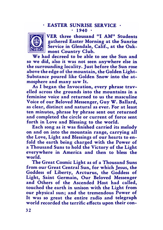 Poem - Easter's Cosmic Dawn; Discourse by Lord Maha Chohan; Discourse by Great Divine Director; Easter Sunrise Service 1940; The Closing Activities of Class; "I AM" Study Groups; Claiming Authority; Gems of Light.
