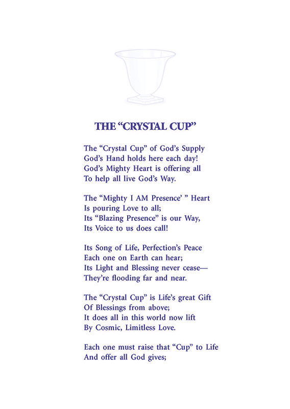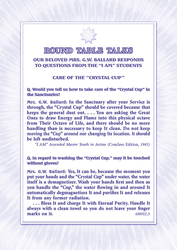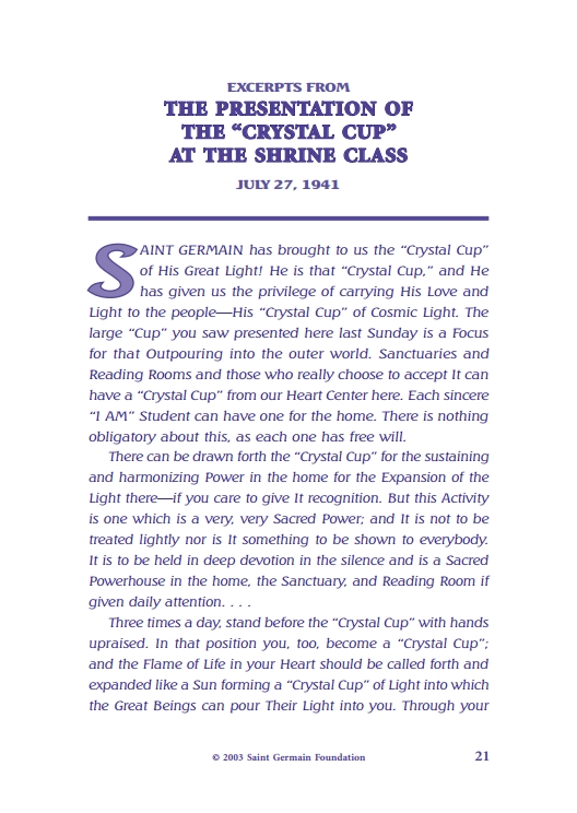 Poem - The Crystal Cup; Discourse by Vesta; Presentation of the Crystal Cup at the Shrine Class; "I AM" Ascended Master Youth; Discourse by Sanat Kumara; Round Table Talks - Care of the Crystal Cup; "I AM" Decrees - Sanat Kumara.About the Edition