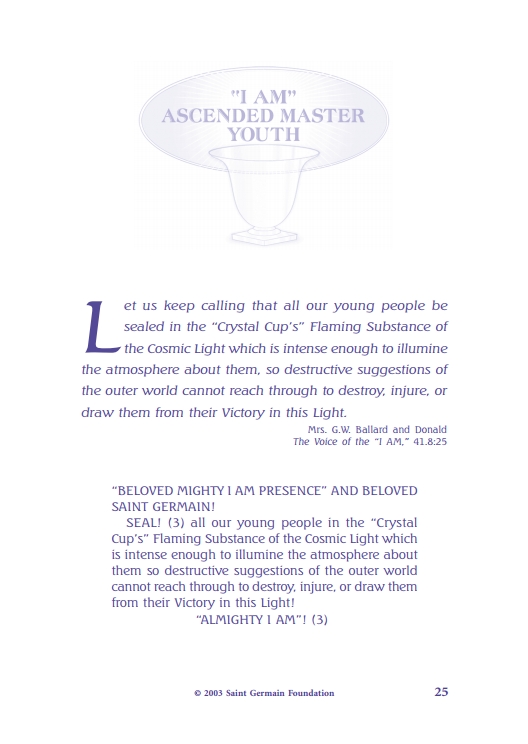 The "Voice of the I AM" monthly Magazine is the Outpouring of the Love, Light, and Illumination from the Beloved Ascended Masters for the enlightenment of all mankind-the Ascended Masters' Instruction on the Fiery Christ Truth of the "Beloved Mighty I AM Presence." The Ascended Masters' Instruction on the Great Laws of Life was first brought forth by the Ascended Master Saint Germain, through His Accredited Messengers, Mr and Mrs GW Ballard. In the early 1930s the Ballards established Saint Germain Foundation and Saint Germain Press, currently a worldwide organization with hundreds of "I AM" Temples and Sanctuaries throughout the world. The "I AM" Activity of Saint Germain Foundation presents this Original Ascended Master Instruction in its pure, unadulterated form, free from human interpretation, in The Voice of the "I AM" monthly Magazine, in the Books of the Saint Germain Series, and in other material released by Saint Germain Foundation and distributed through Saint Germain Press.Associated Items