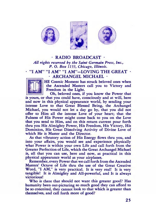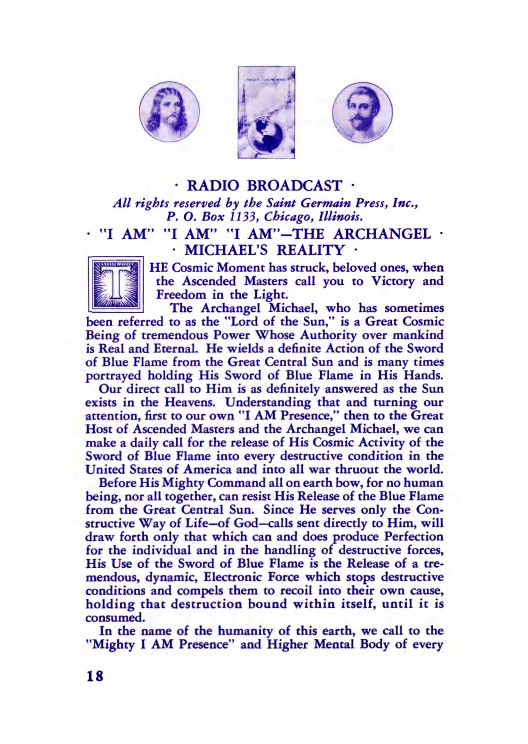 The "Voice of the I AM" monthly Magazine is the Outpouring of the Love, Light, and Illumination from the Beloved Ascended Masters for the enlightenment of all mankind-the Ascended Masters' Instruction on the Fiery Christ Truth of the "Beloved Mighty I AM Presence." The Ascended Masters' Instruction on the Great Laws of Life was first brought forth by the Ascended Master Saint Germain, through His Accredited Messengers, Mr and Mrs GW Ballard. In the early 1930s the Ballards established Saint Germain Foundation and Saint Germain Press, currently a worldwide organization with hundreds of "I AM" Temples and Sanctuaries throughout the world. The "I AM" Activity of Saint Germain Foundation presents this Original Ascended Master Instruction in its pure, unadulterated form, free from human interpretation, in The Voice of the "I AM" monthly Magazine, in the Books of the Saint Germain Series, and in other material released by Saint Germain Foundation and distributed through Saint Germain Press.