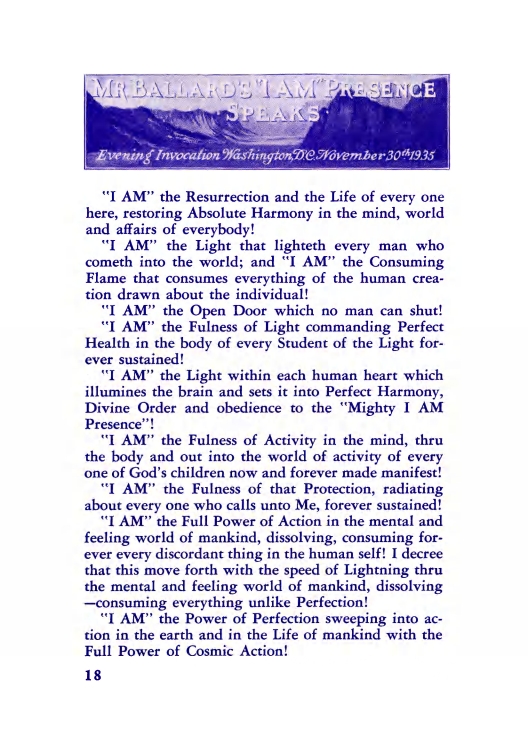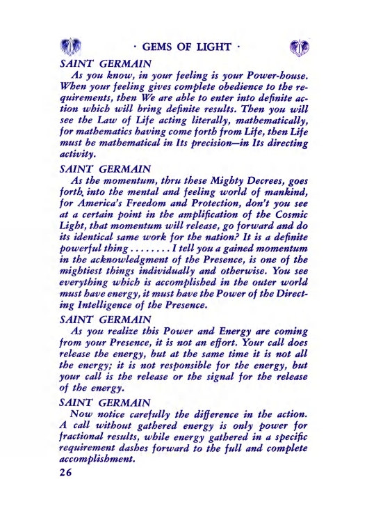 The "Voice of the I AM" monthly Magazine is the Outpouring of the Love, Light, and Illumination from the Beloved Ascended Masters for the enlightenment of all mankind-the Ascended Masters' Instruction on the Fiery Christ Truth of the "Beloved Mighty I AM Presence." The Ascended Masters' Instruction on the Great Laws of Life was first brought forth by the Ascended Master Saint Germain, through His Accredited Messengers, Mr and Mrs GW Ballard. In the early 1930s the Ballards established Saint Germain Foundation and Saint Germain Press, currently a worldwide organization with hundreds of "I AM" Temples and Sanctuaries throughout the world. The "I AM" Activity of Saint Germain Foundation presents this Original Ascended Master Instruction in its pure, unadulterated form, free from human interpretation, in The Voice of the "I AM" monthly Magazine, in the Books of the Saint Germain Series, and in other material released by Saint Germain Foundation and distributed through Saint Germain Press.