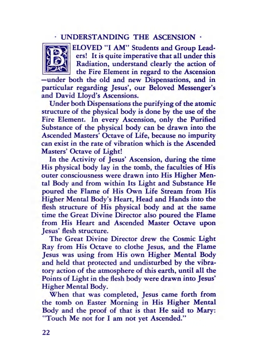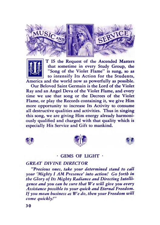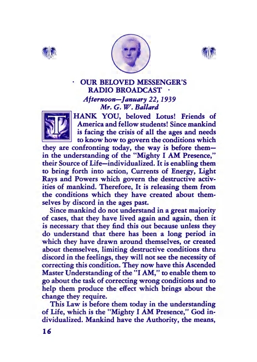The "Voice of the I AM" monthly Magazine is the Outpouring of the Love, Light, and Illumination from the Beloved Ascended Masters for the enlightenment of all mankind-the Ascended Masters' Instruction on the Fiery Christ Truth of the "Beloved Mighty I AM Presence." The Ascended Masters' Instruction on the Great Laws of Life was first brought forth by the Ascended Master Saint Germain, through His Accredited Messengers, Mr and Mrs GW Ballard. In the early 1930s the Ballards established Saint Germain Foundation and Saint Germain Press, currently a worldwide organization with hundreds of "I AM" Temples and Sanctuaries throughout the world. The "I AM" Activity of Saint Germain Foundation presents this Original Ascended Master Instruction in its pure, unadulterated form, free from human interpretation, in The Voice of the "I AM" monthly Magazine, in the Books of the Saint Germain Series, and in other material released by Saint Germain Foundation and distributed through Saint Germain Press.