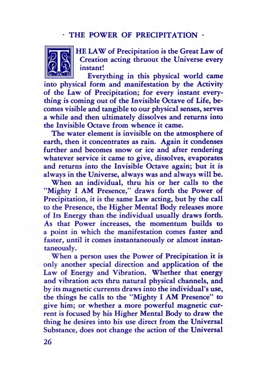 Poem - Thy Table; Discourse by Sanat Kumara; Radio Broadcast; Understanding the Ascension; The Power of Precipitation; Music and Service; "I AM" Study Groups.